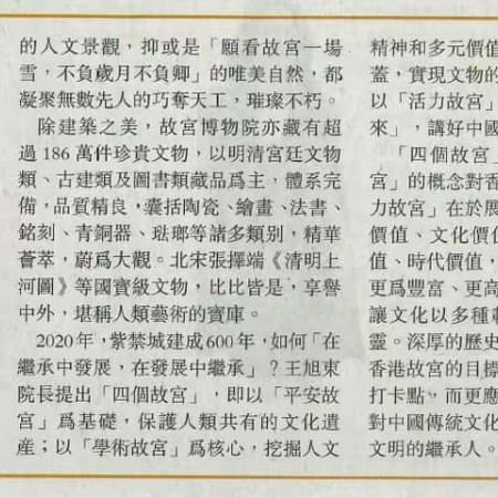 很榮幸日前能夠參與香港故宮文化博物館開幕典禮。香港故宮文化博物館將會成為向世界弘揚中華傳統文化的窗口,對促進中外文化交流發揮重要作用。國家「十四五」規劃中明確支持香港建設中外文化藝術交流中心,相信香港在「一國兩制」的制度優勢以及國家的支持下,未來可以更好地說好中國故事和香港故事。最近,我讀到中國文化研究院院長邱逸博士的一篇評論,我十分認同當中提到「四個故宮」中「活力故宮」對香港的啟示最大。我認為香港故宮文化博物館未來不應只限於成為旅遊打卡熱點,同時也要傳遞豐富和高品質的精神文化生活理念,推動香港青少年對中華傳統文化的認識。希望通過社會共同努力,我們可以讓中華文明生生不息、風華永茂!
